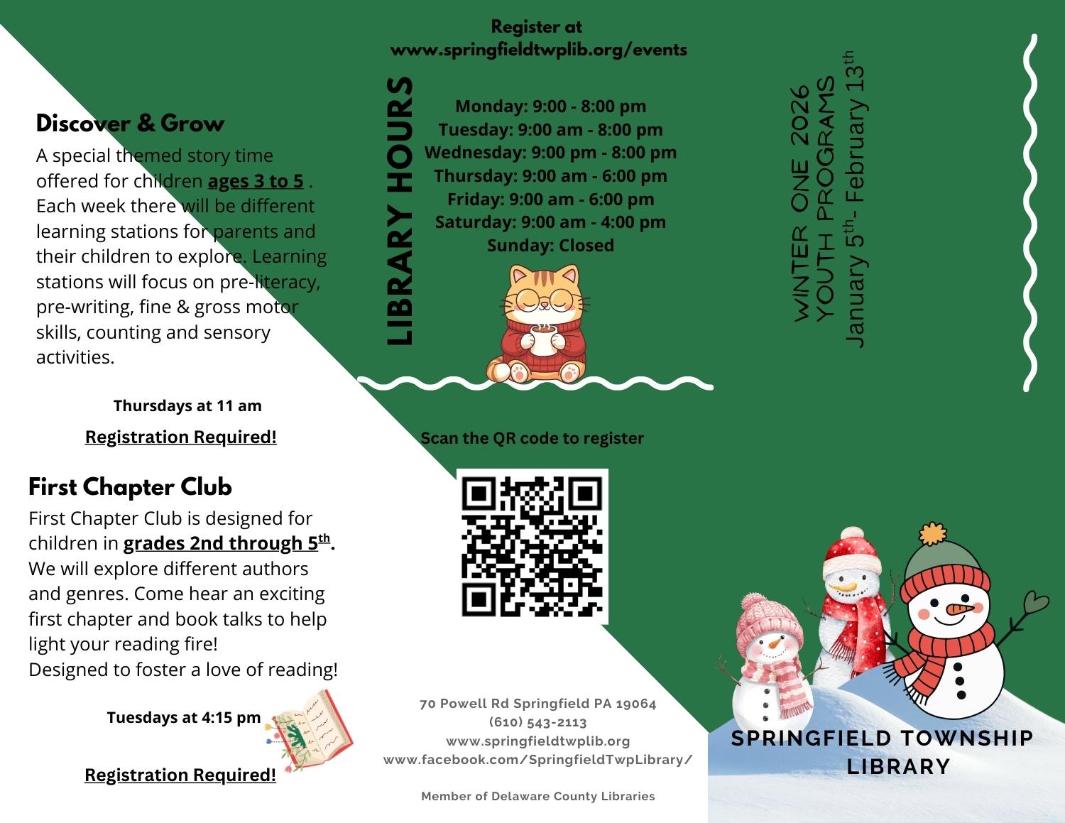 Springfield Township Library offers educational, fun opportunities for children from birth to age 18, as well as a variety of books, films, & music, available in physical and online formats.